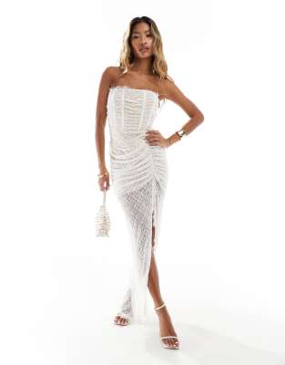 Spitzen maxikleid weiss clearance, Rare – London – Korsett-Maxikleid in Weiß mit Spitze, gerüschtem Lagendesign und Beinschlitz | ASOS clearance