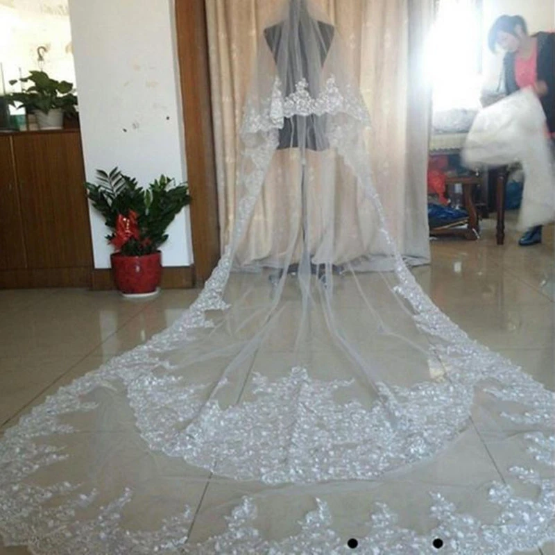 - Cheap Chapel length veil with lace applique