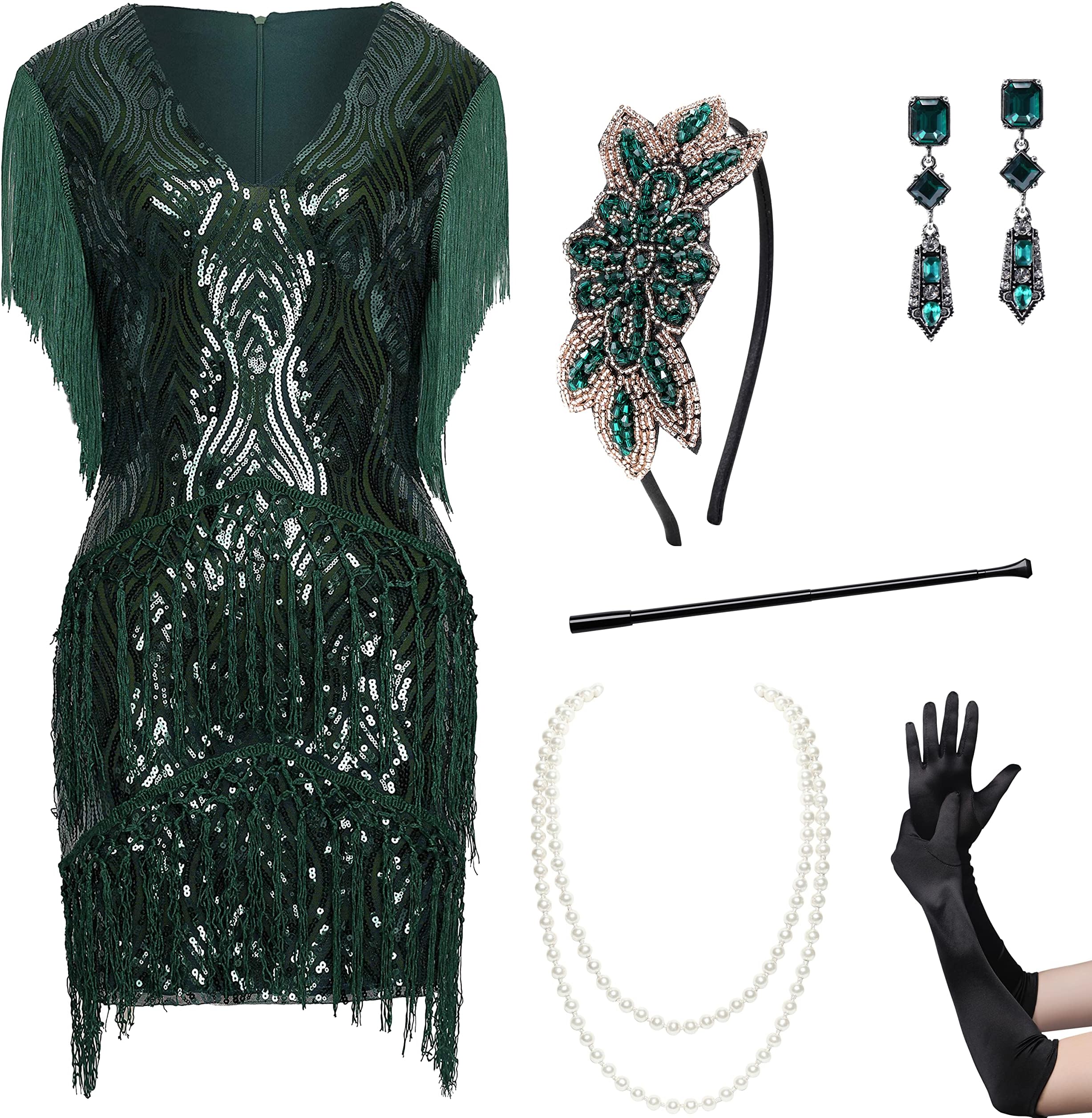 1920s long dress uk clearance, Women's 1920s Gatsby Inspired Sequin Beads Long Fringe Flapper Dress w/Accessories Set clearance