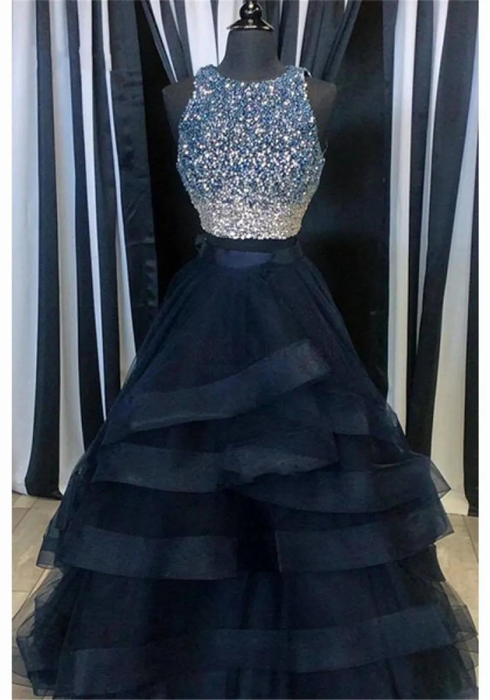 - Navy blue prom dress with rhinestones