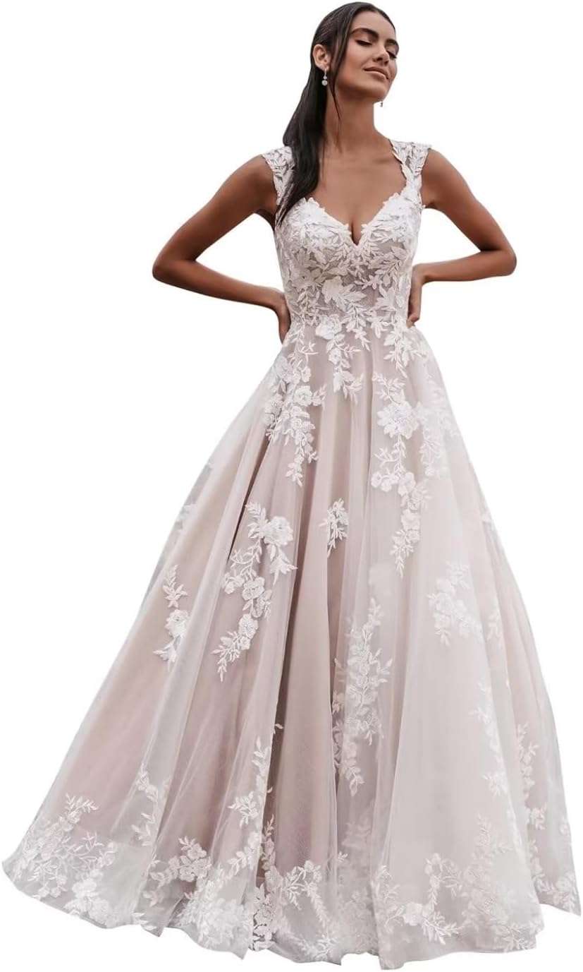 A line wedding gown clearance, Zeeyecie V Back Wedding Dresses Sexy Elegant A-Line Glitter Lace Applique Floor Length Long Bridal Gown for Bride 2024 clearance