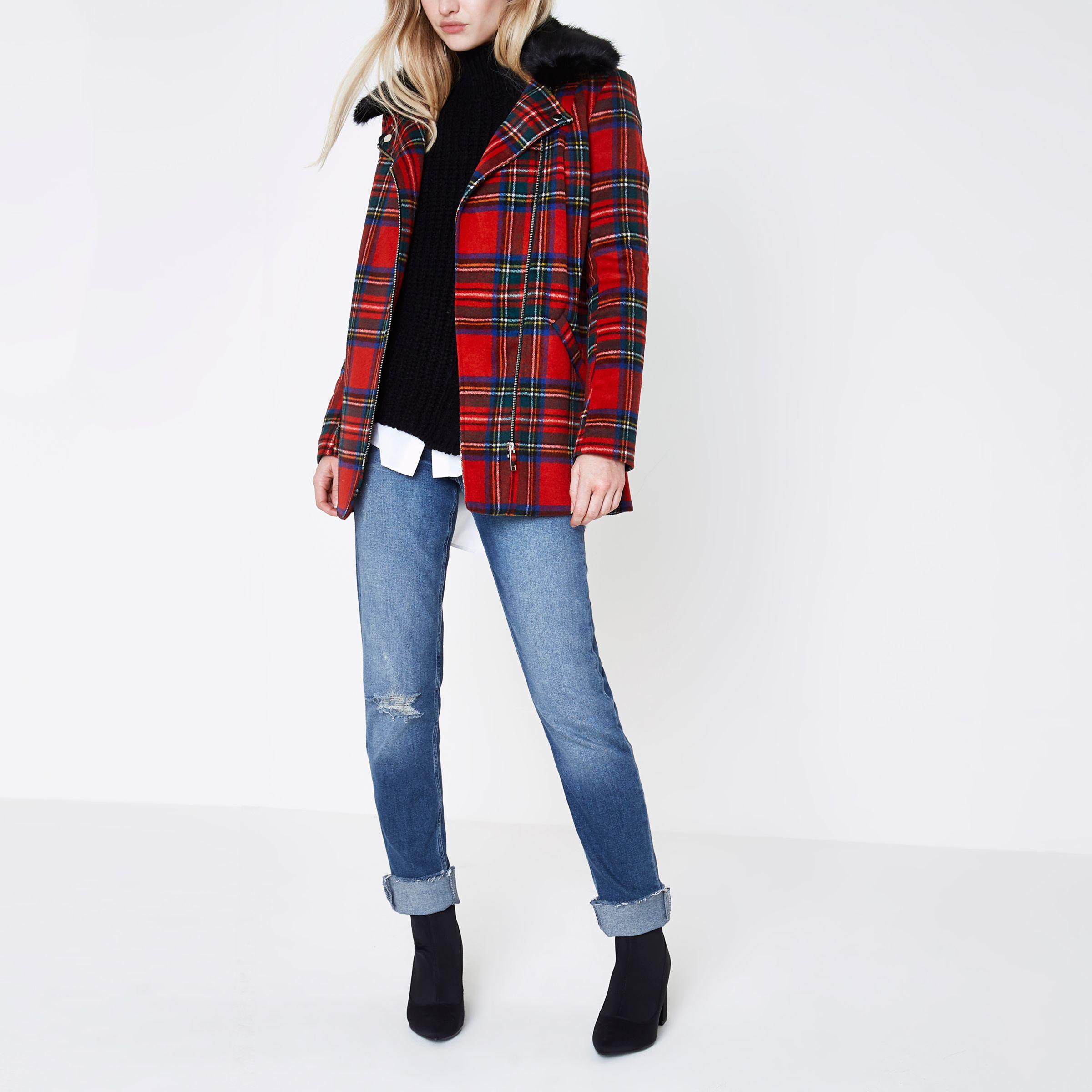 - River island red tartan coat shop