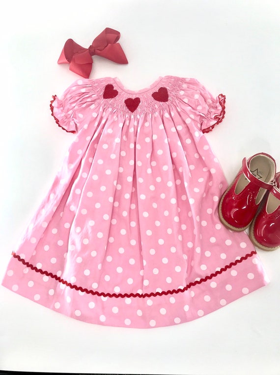 Smocked valentines dress clearance, Valentine Smocked Dress red hearts on pink polka dot | Etsy clearance