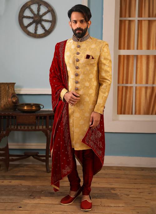 Sherwani style suit clearance, Wedding Wear Golden Brocade Embroidery clearance