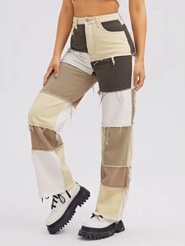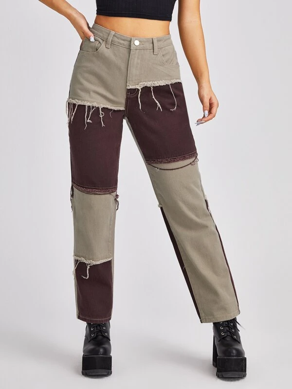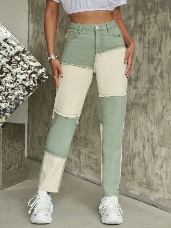 Shein color block pants clearance, Colorblock Raw Trim Cropped Jeans clearance