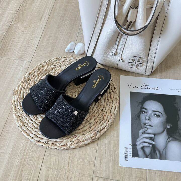 Chanel rhinestone slides clearance, Chanel Rhinestone Pearl Thick Heel Slippers Casual Fashion Wearing Sandals and Slippers | Lazada PH clearance