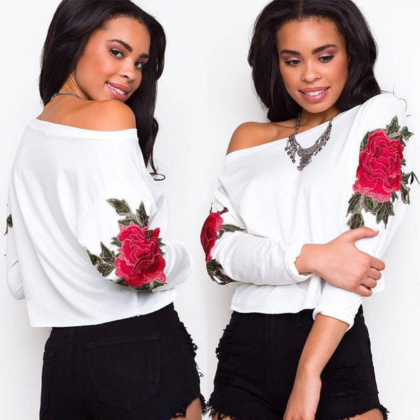 White blouse with red flowers clearance, Women's Fashion Sexy Off Shoulder Tops clearance