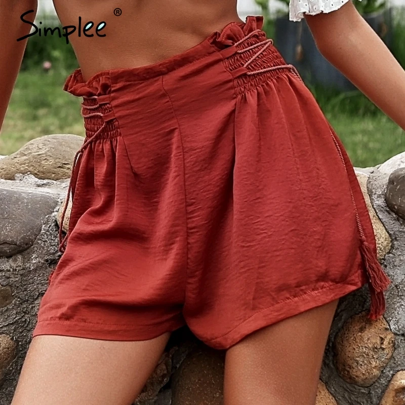 High loose women's shorts clearance, Simplee Ruffle loose elastic high waist shorts Tassel lace up wide leg casual shorts A line clearance