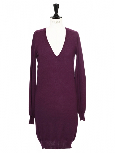Plum knitted dress clearance, virgin wool V neck knitted dress Retail clearance
