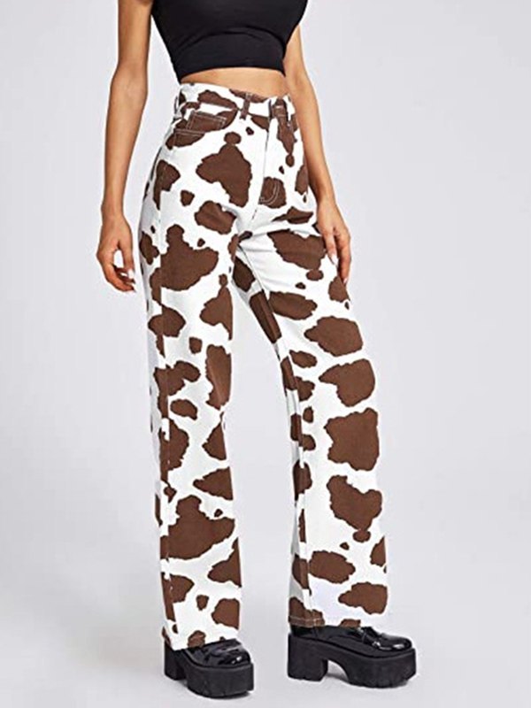 Cow print pants brown clearance, High Rise Straight Leg Cow Print Pants clearance