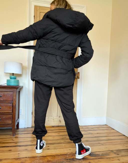 - Cheap Bershka belted padded puffer jacket with hood