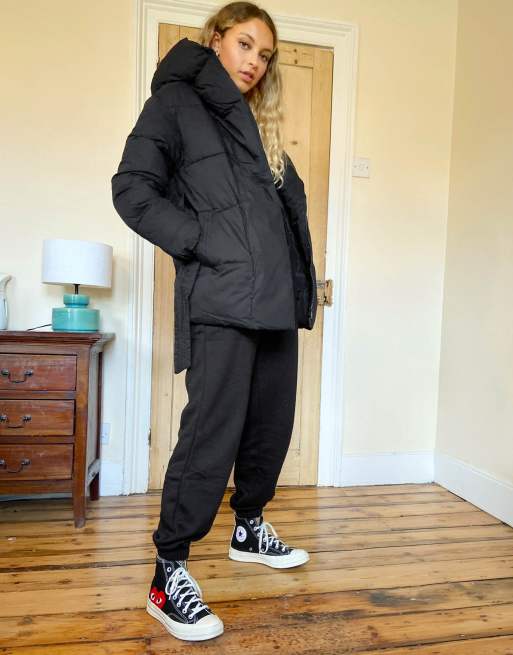 Bershka belted padded puffer jacket with hood clearance, Bershka belted padded puffer jacket with hood in black | ASOS clearance