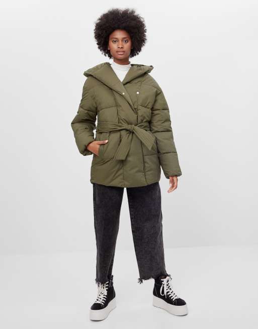 - Bershka belted padded puffer jacket with hood outlet