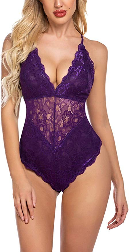 Dark purple lace bodysuit clearance, Women Snap Crotch Lingerie Sexy Lace clearance