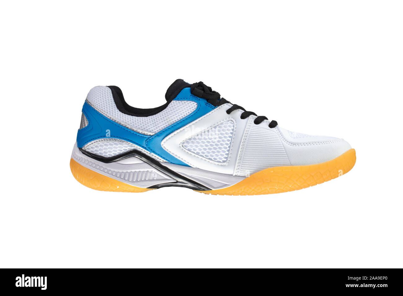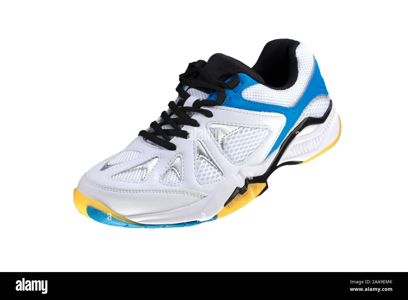 White sneakers with blue stripes clearance, white background. Sport shoes Stock clearance