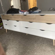 Dowler 8 drawer double dresser clearance, 8 Drawer Wide Dresser in White and Oak clearance