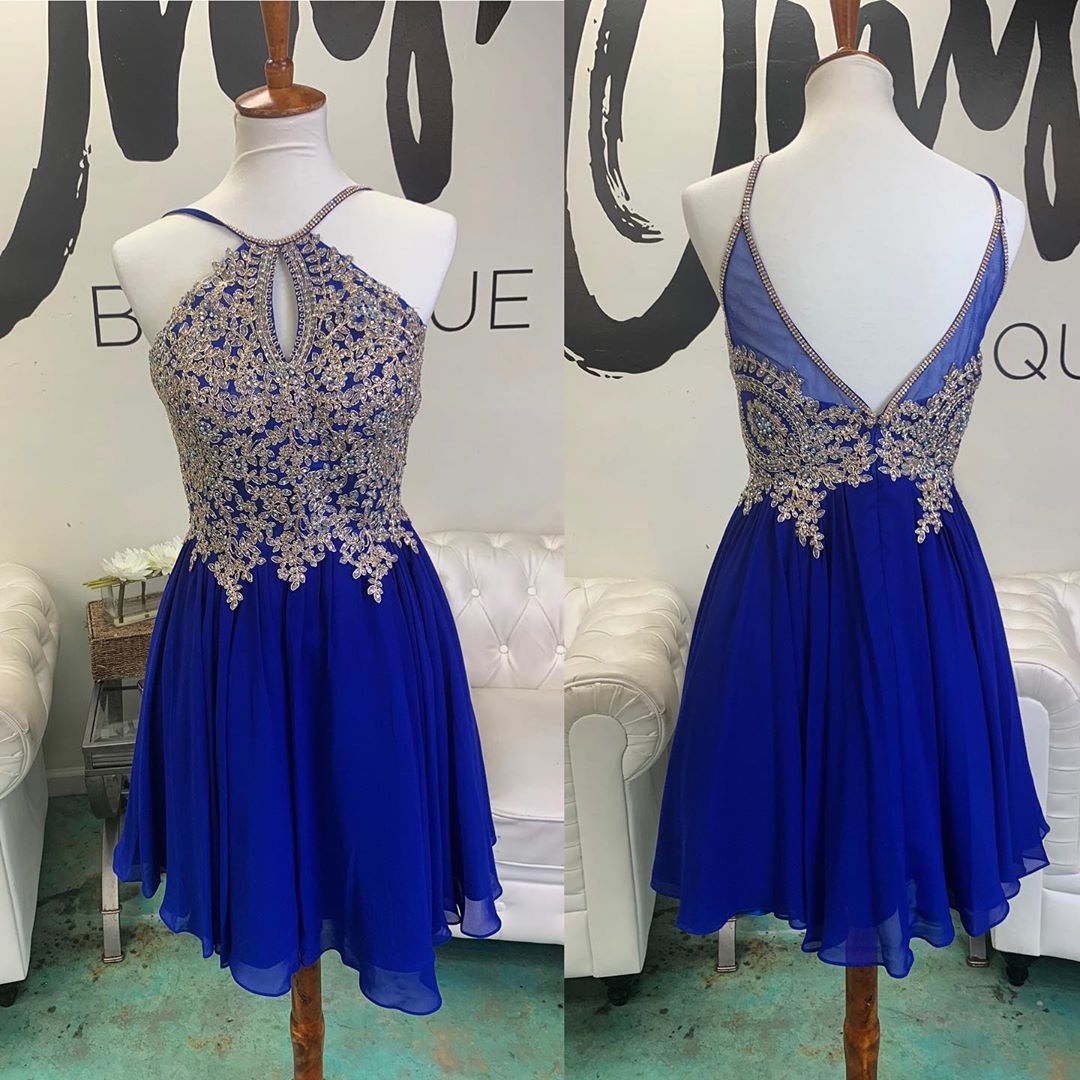 Royal blue and gold dress short clearance, Halter Juniors Cocktail Party Dresses clearance