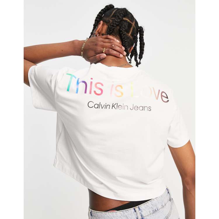 Calvin klein tagline clearance, Calvin Klein Jeans pride capsule cropped slogan t-shirt in white | ASOS clearance