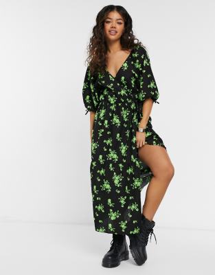 Green floral wrap midi dress clearance