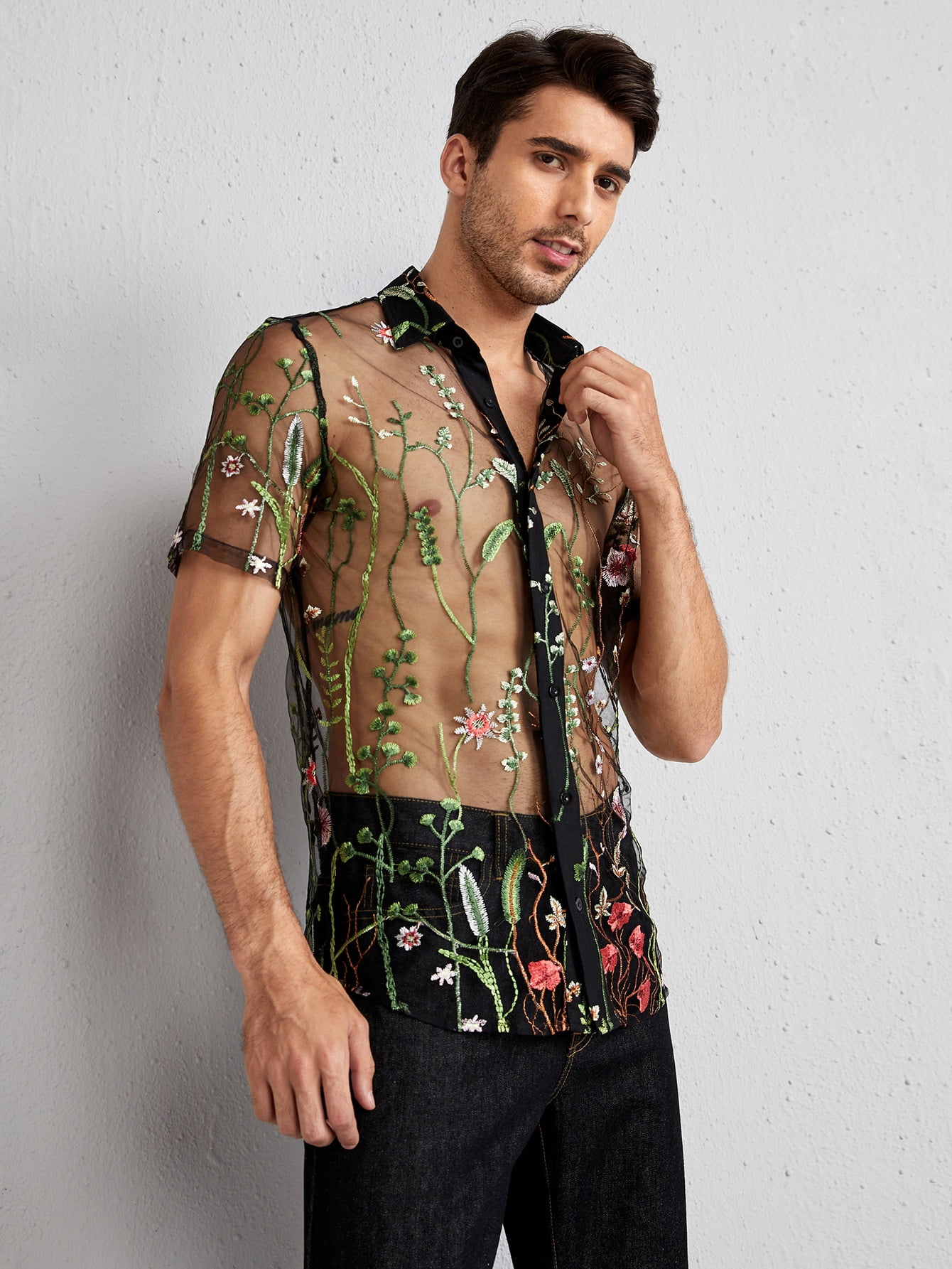 Mens sheer button up shirt clearance, Men Floral Embroidery Sheer Mesh Shirt clearance