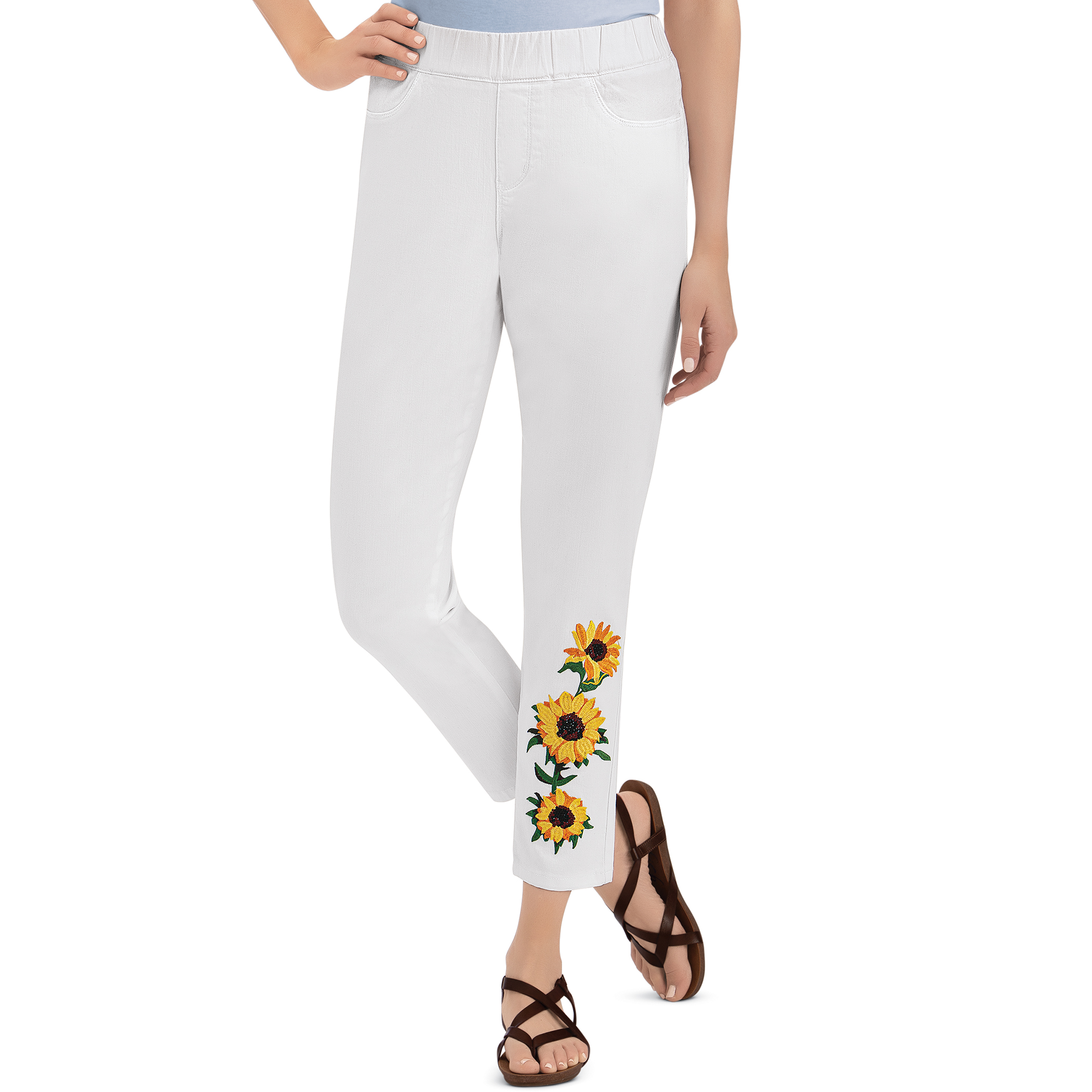 White sunflower jeans clearance, Embroidered Summer Sunflowers White clearance