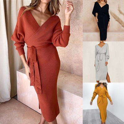 Midi dress jumper clearance, Women Casual V Neck Jumper Dress Ladies clearance