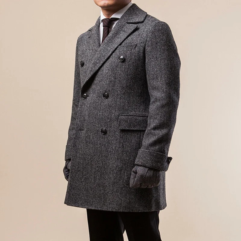 Wool lapel coat clearance, 2020 Men's Black Herringbone Long clearance