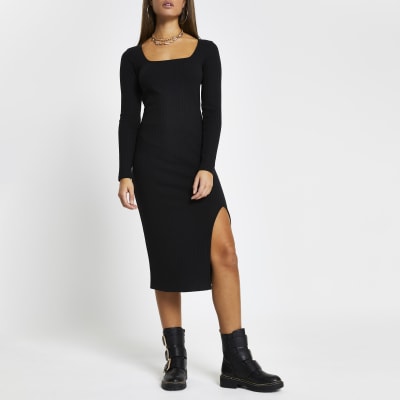River island black ribbed dress clearance, Black ribbed frill split front dress clearance