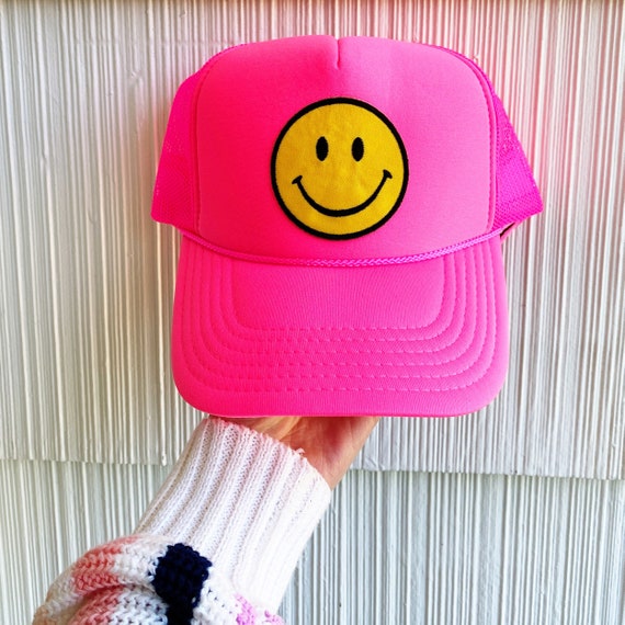 Pink smiley face hat clearance, Hot Pink White Smiley Face Embroidered clearance
