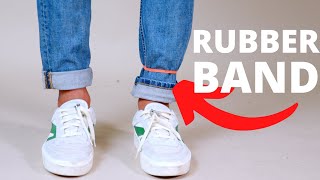 Cuffing jeans with rubber band clearance, Pants too long? Put a rubber band clearance
