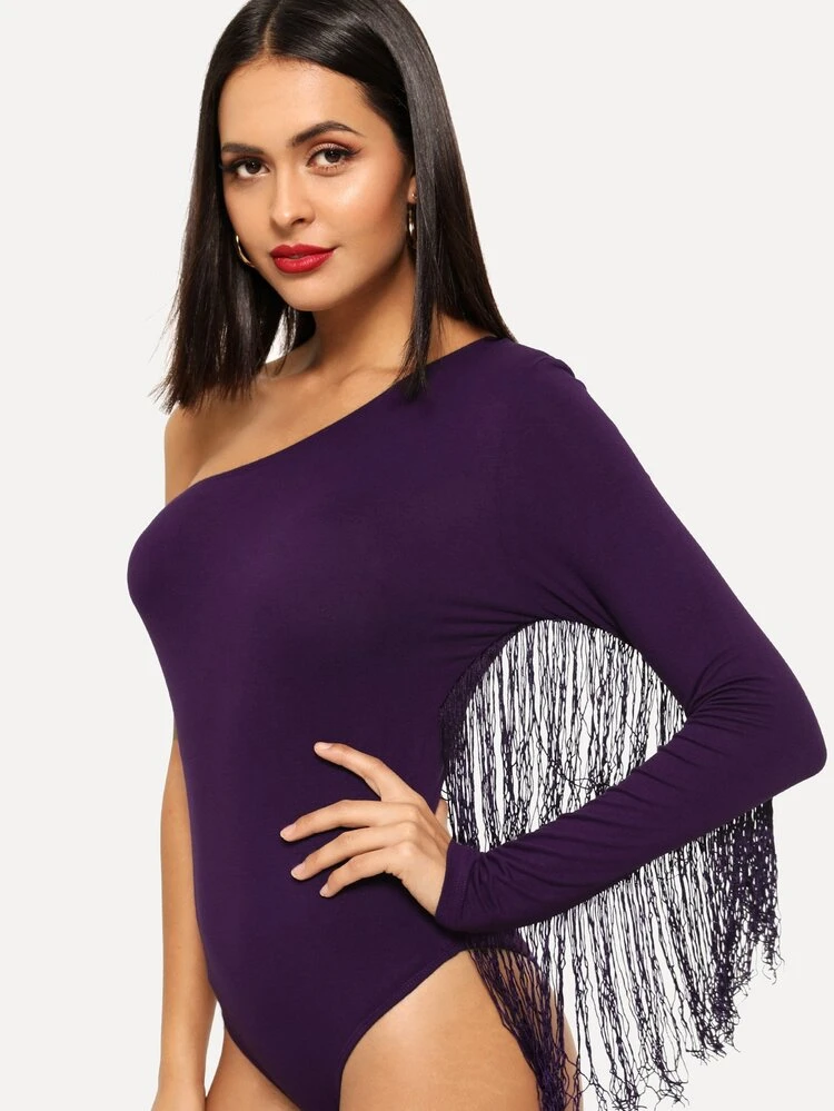 - Fringe trim one shoulder bodysuit free shipping
