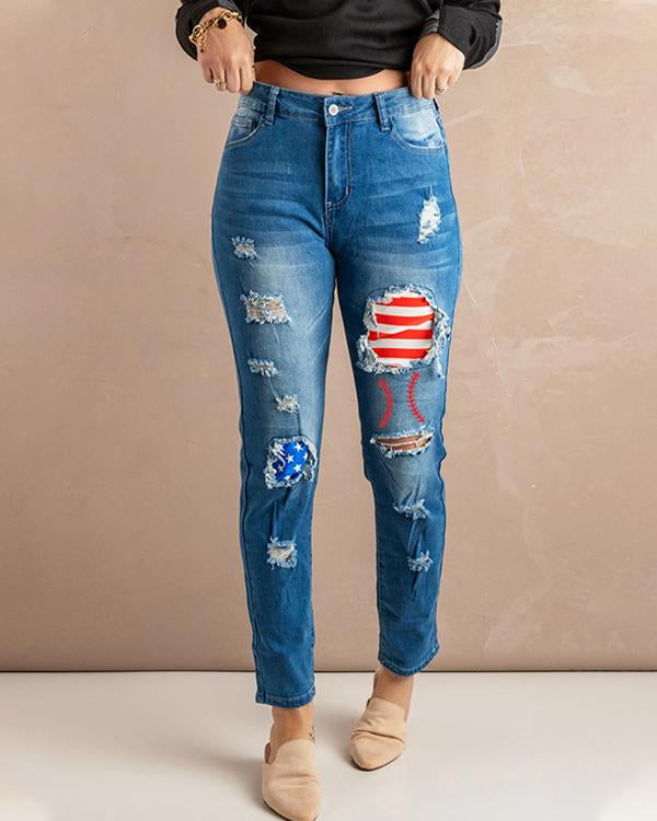 Baseball ripped jeans clearance, Blue Baseball Print Ripped Jeans clearance