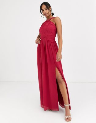 Halter neck dress with split clearance, Red Halter Neck Ruched Split Maxi Dress clearance