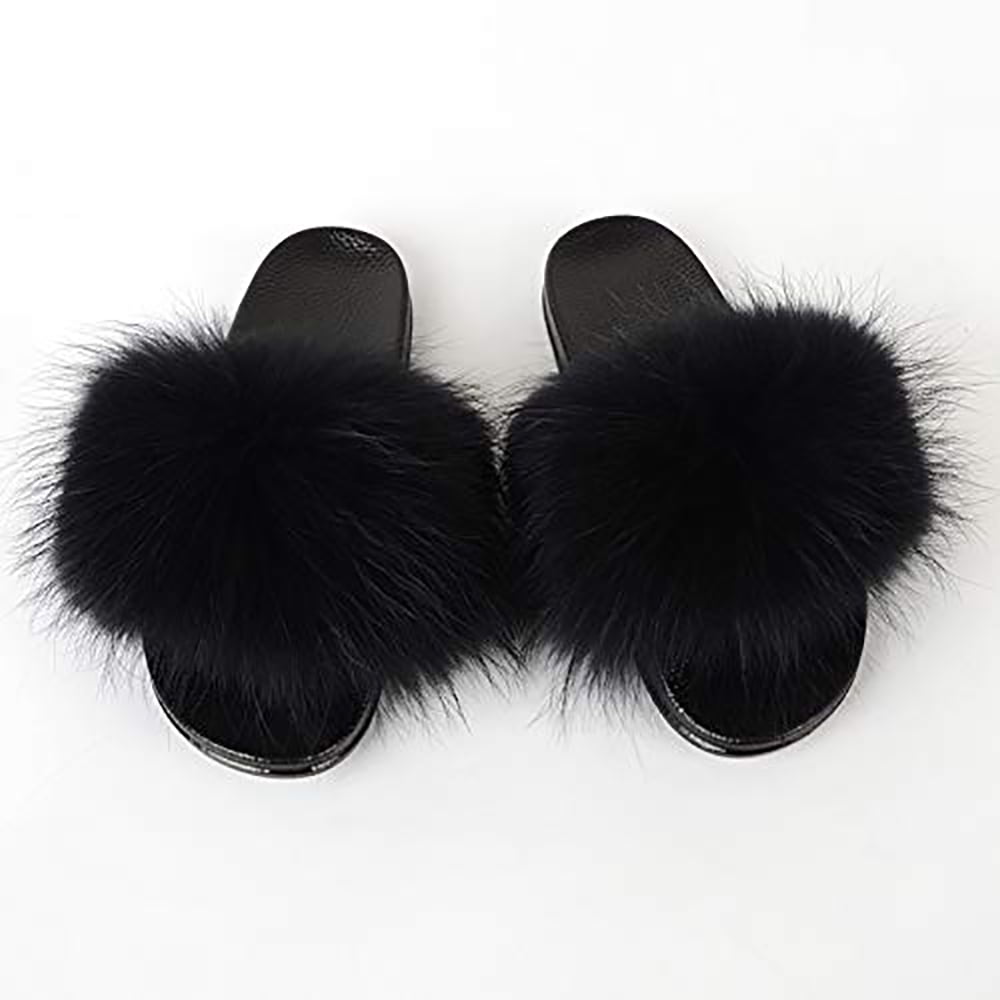 Black fluffy shoes clearance, Womens Faux Fur Flat Slide Sandals clearance