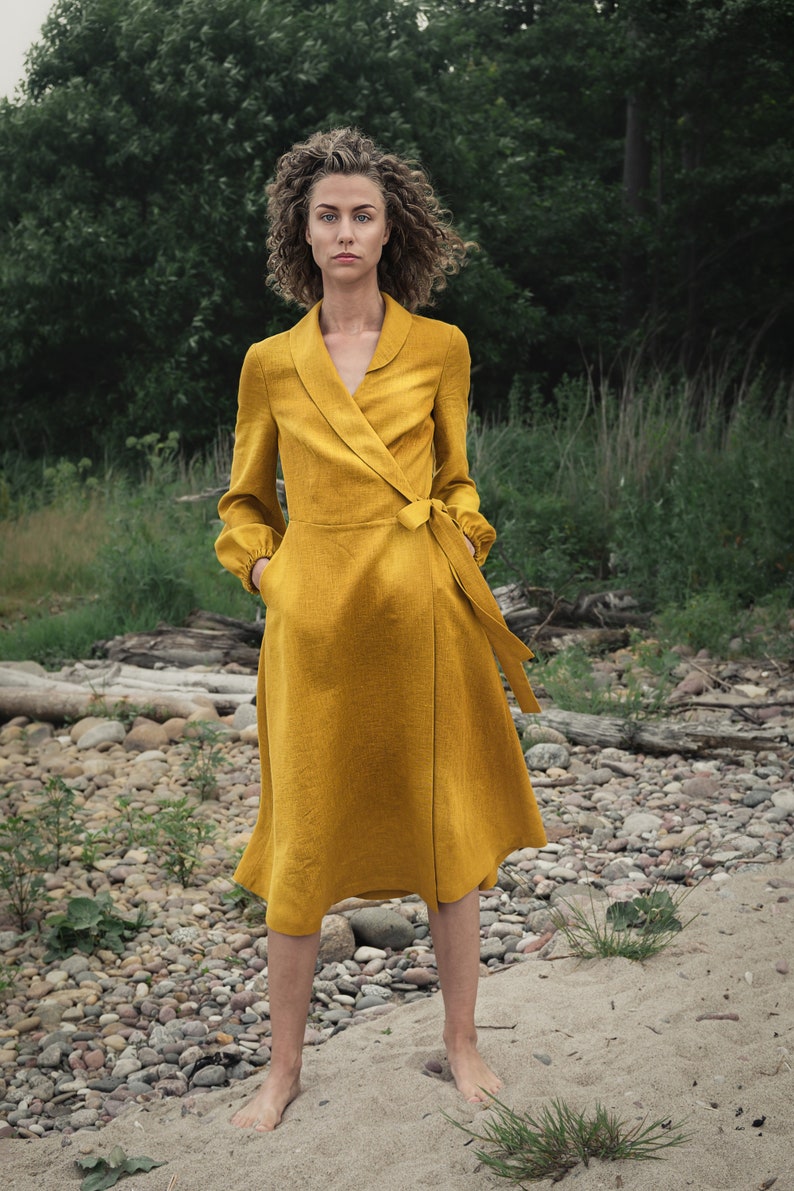 Mustard yellow linen dress clearance, Mustard yellow linen shirtdress Wrap clearance