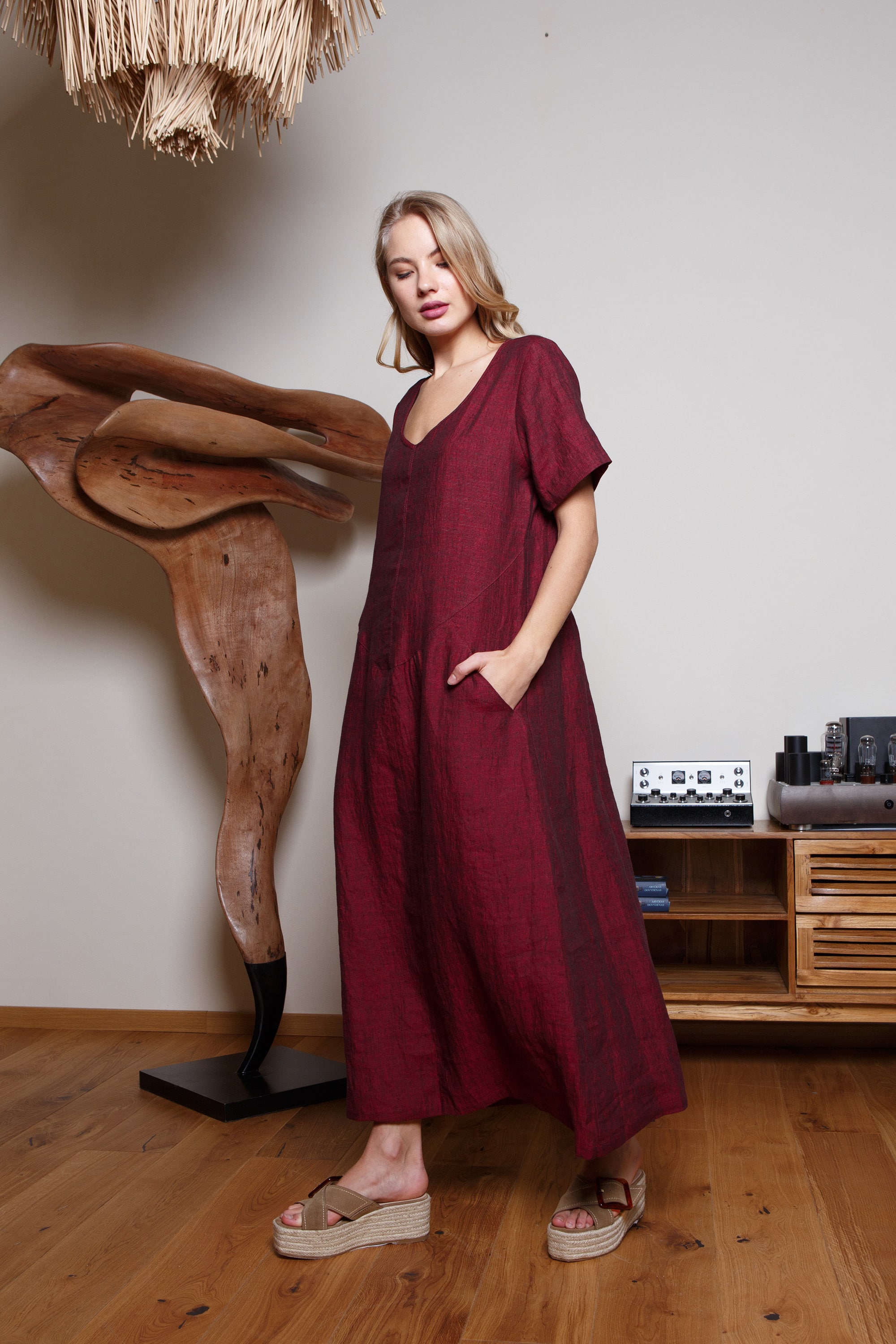Burgundy linen dress clearance