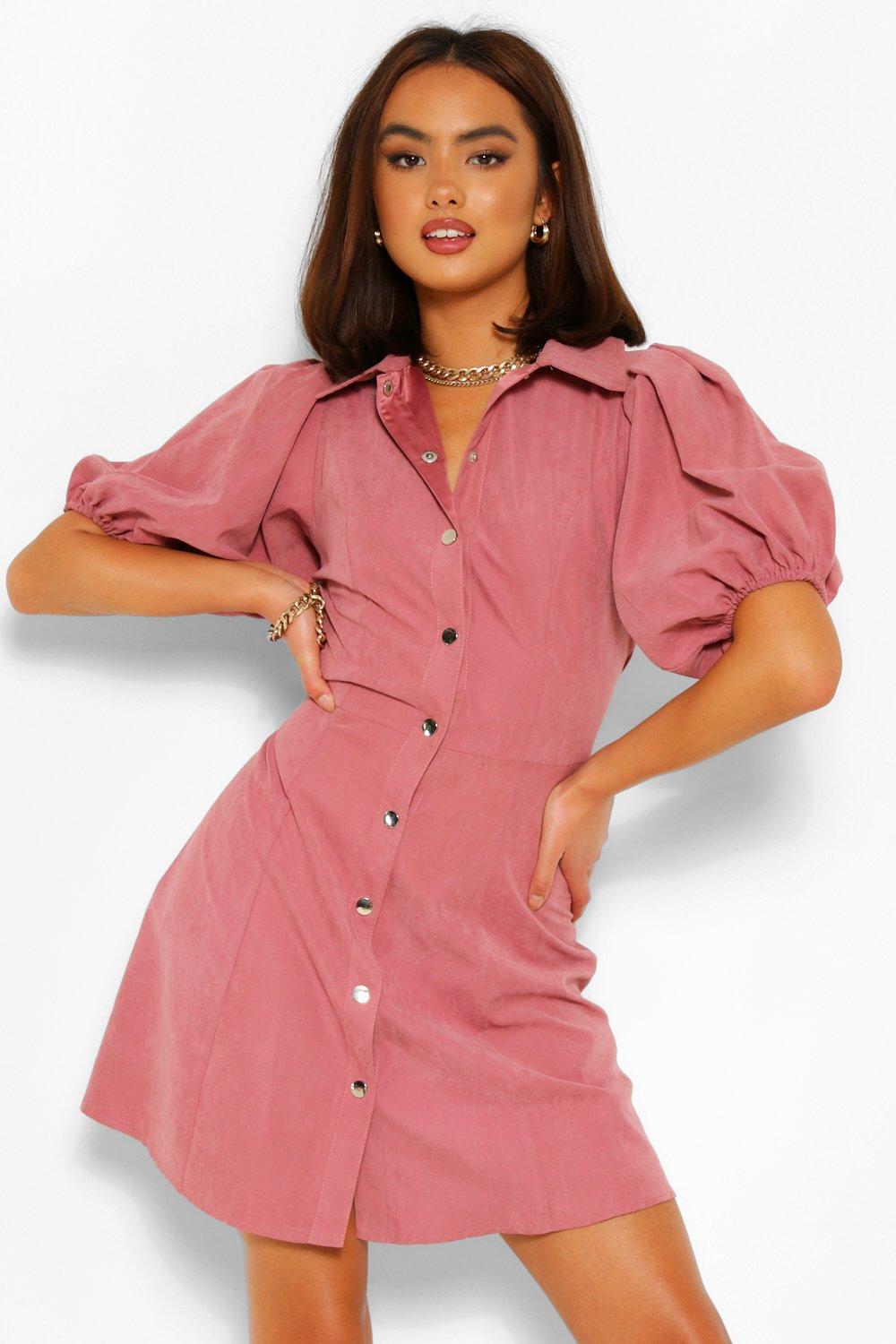 Button down pink dress clearance, Puff Sleeve Button Down Shirt Dress clearance