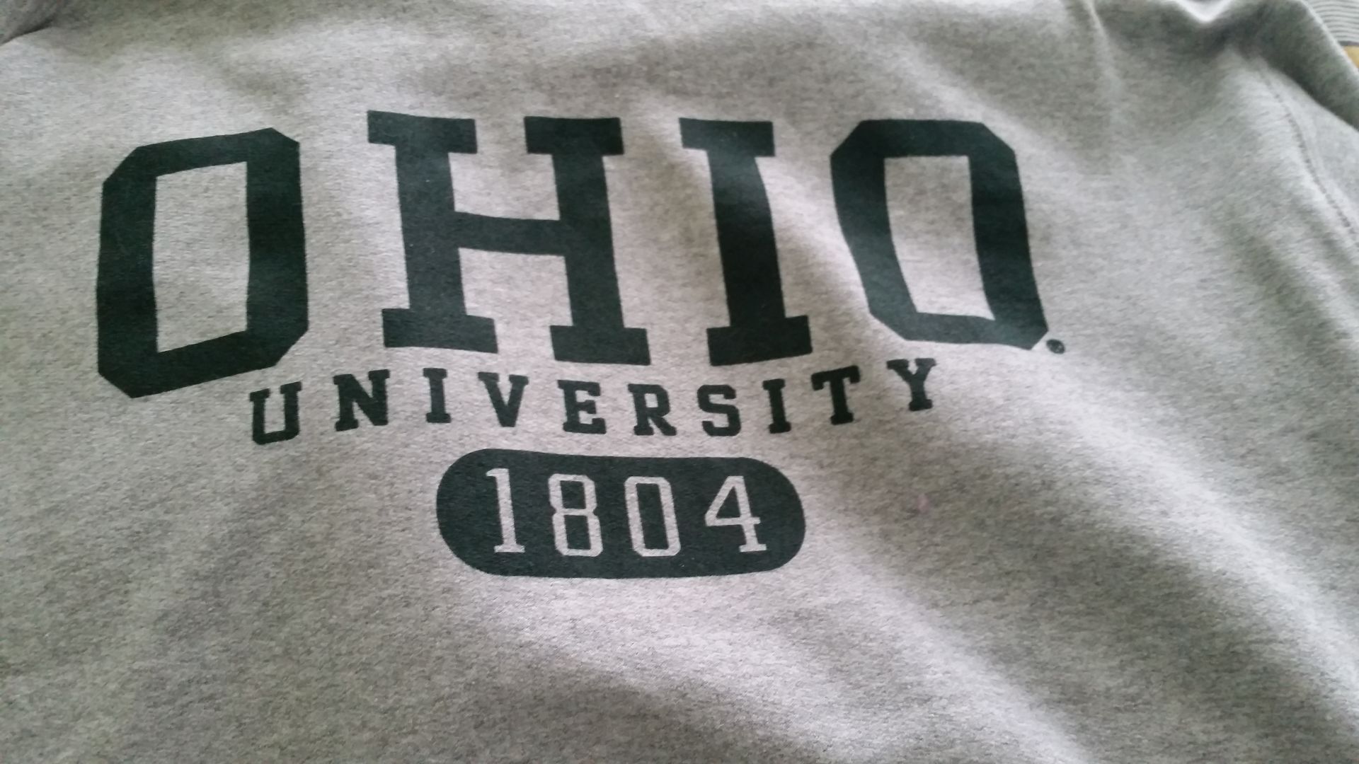 - Grey sweatshirt with green writing