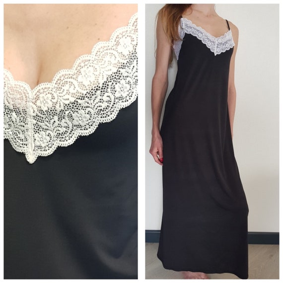 Long black cotton nightdress clearance, Long cotton black nightgown with lace clearance