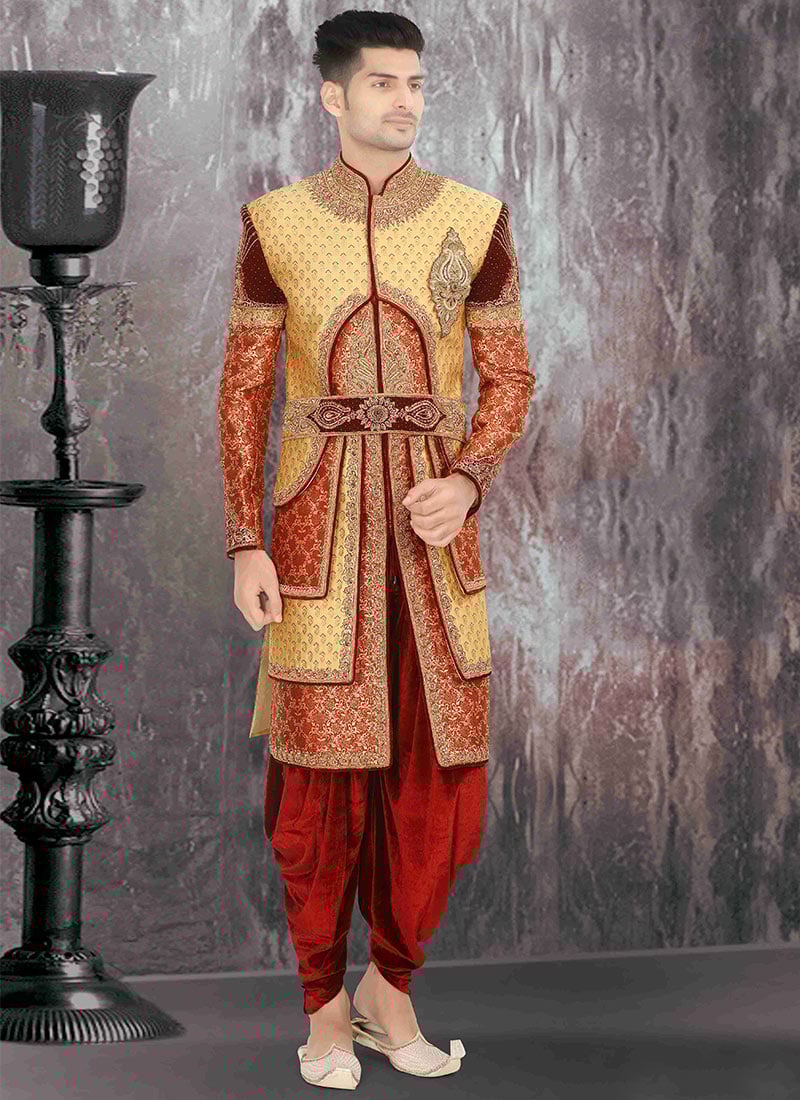 Sherwani red and gold clearance, Wedding dresses men indian clearance