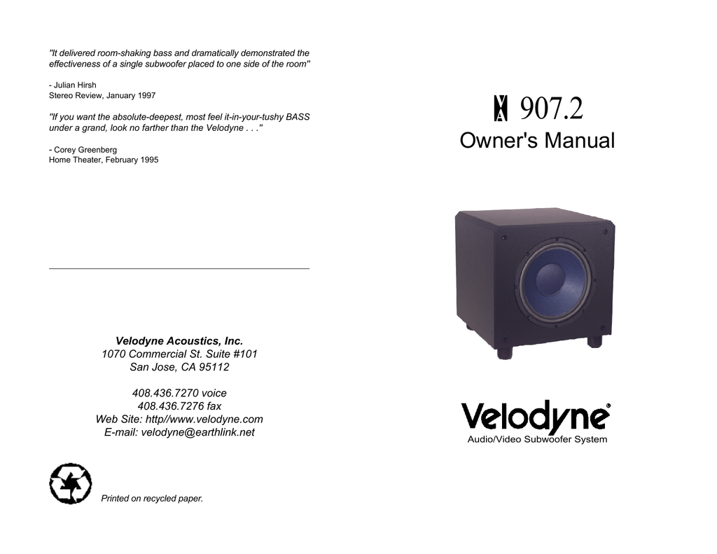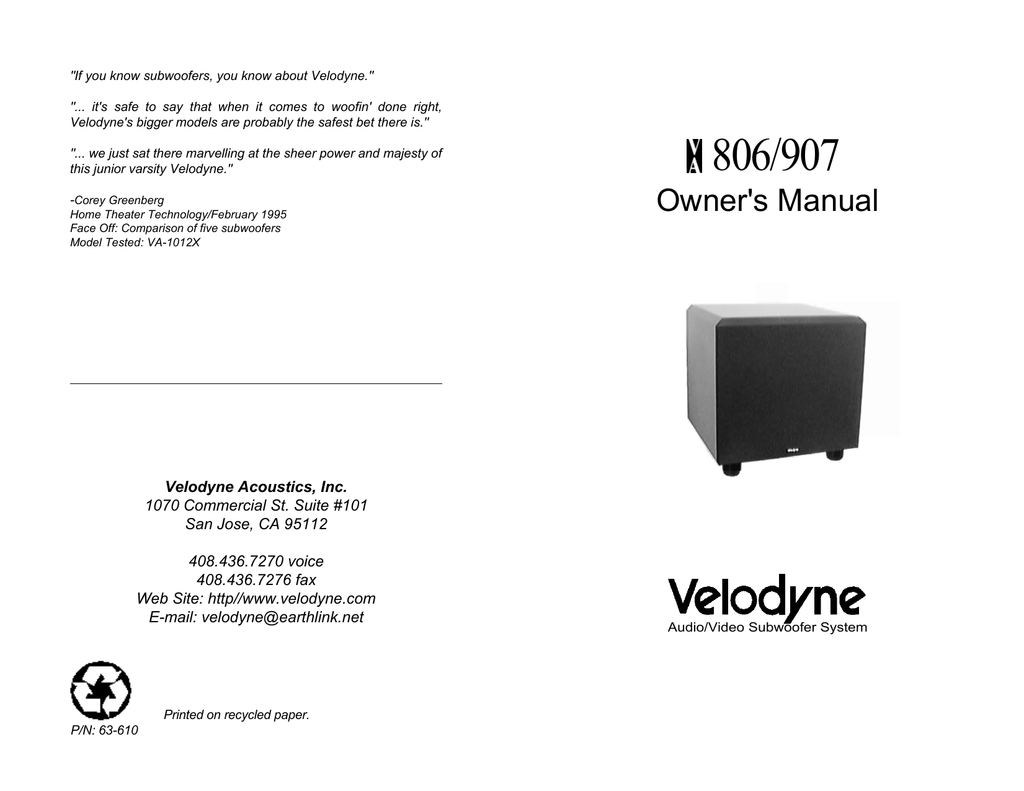Velodyne va 907 clearance, Velodyne Acoustics VA-907.2 User's clearance