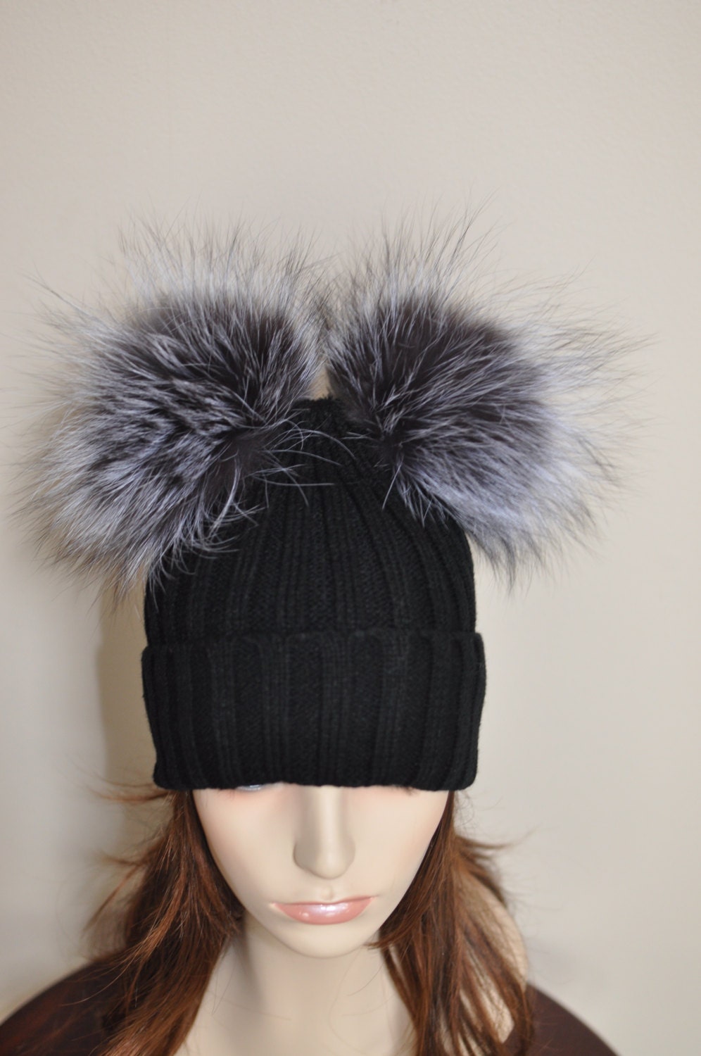Black hat 2 pom poms clearance, Kylie Jenner Beanie Hat 2 Fur pompoms clearance