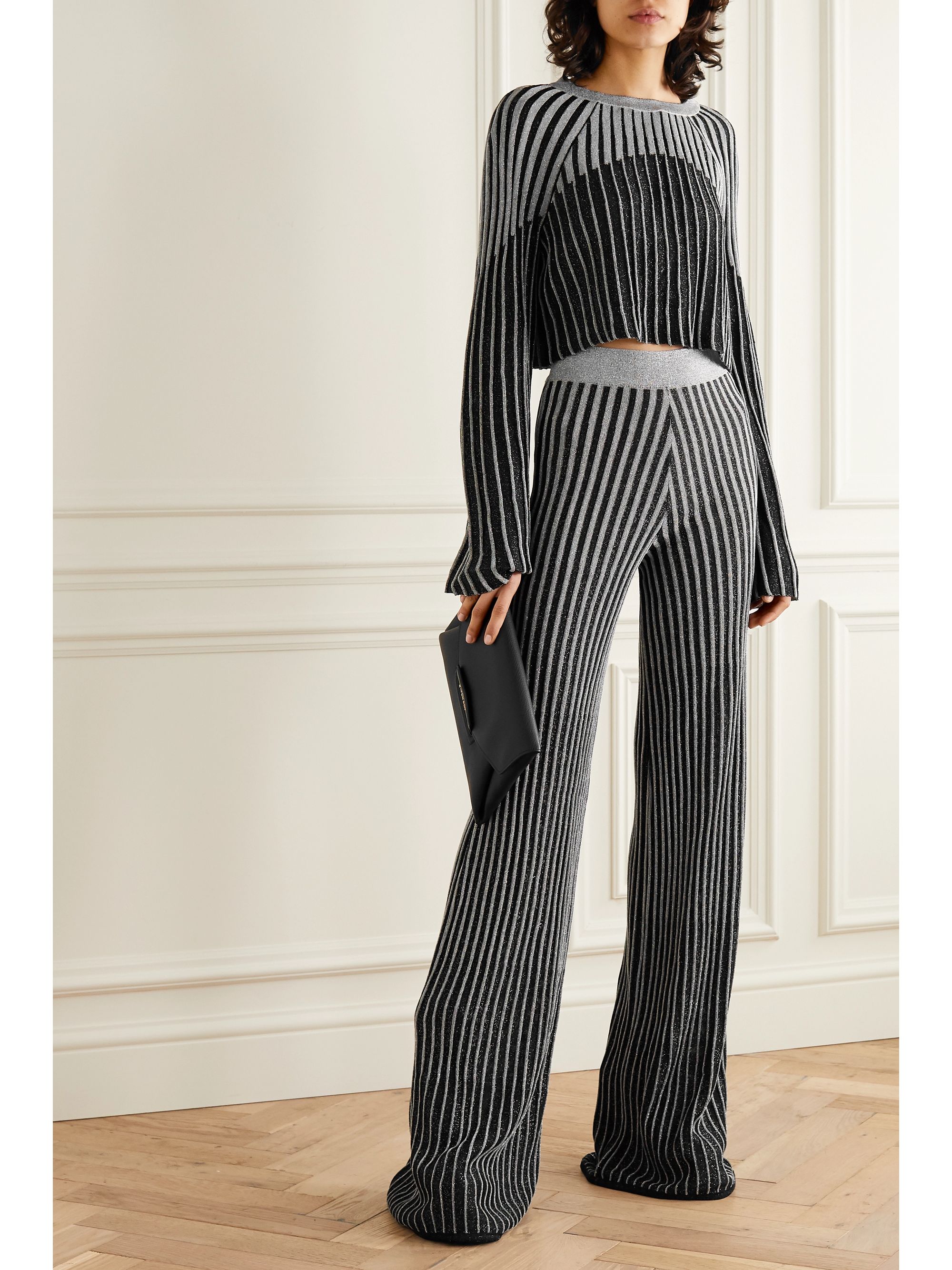 Knit flare pants clearance, Black Metallic ribbed-knit flared pants clearance