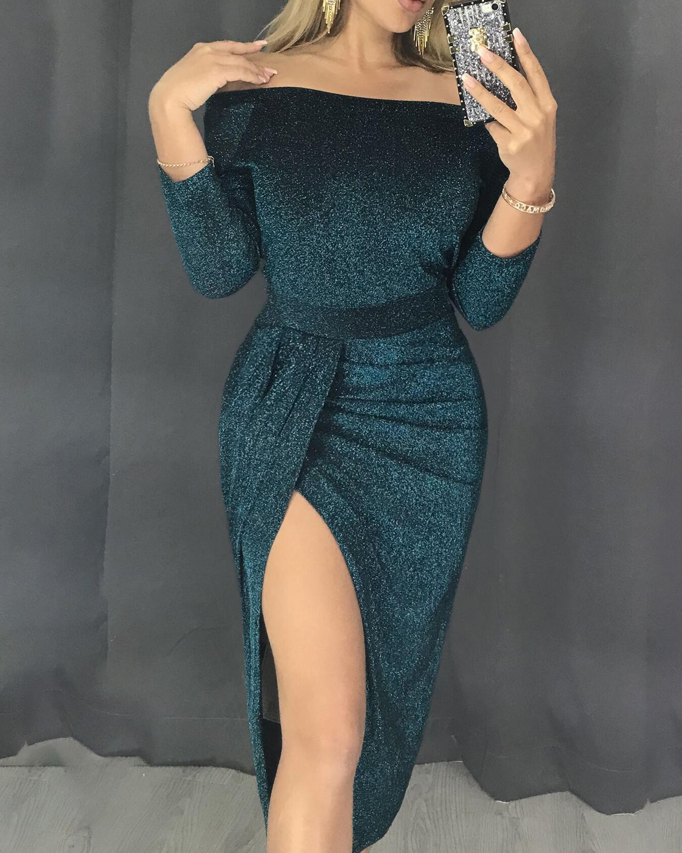 - Shopping Glitter ruched thigh slit party dress