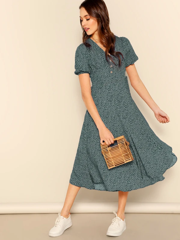Shein tea dress clearance, SHEIN Allover Print Puff Sleeve Button clearance