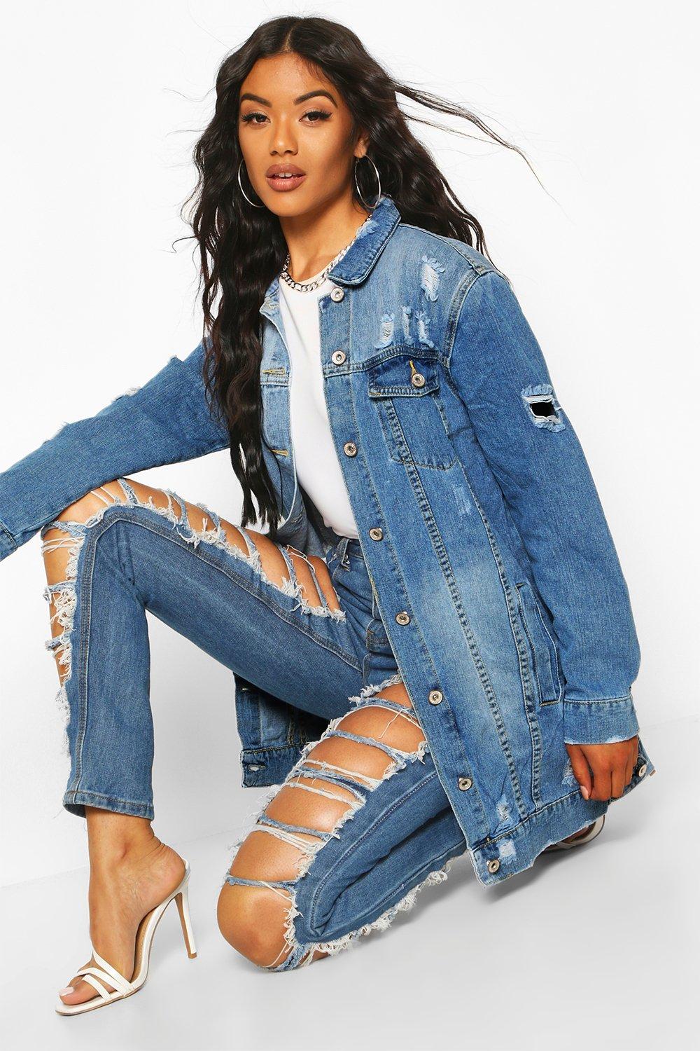 Boohoo long denim jacket clearance, Longline Distressed Denim Jacket | boohoo clearance