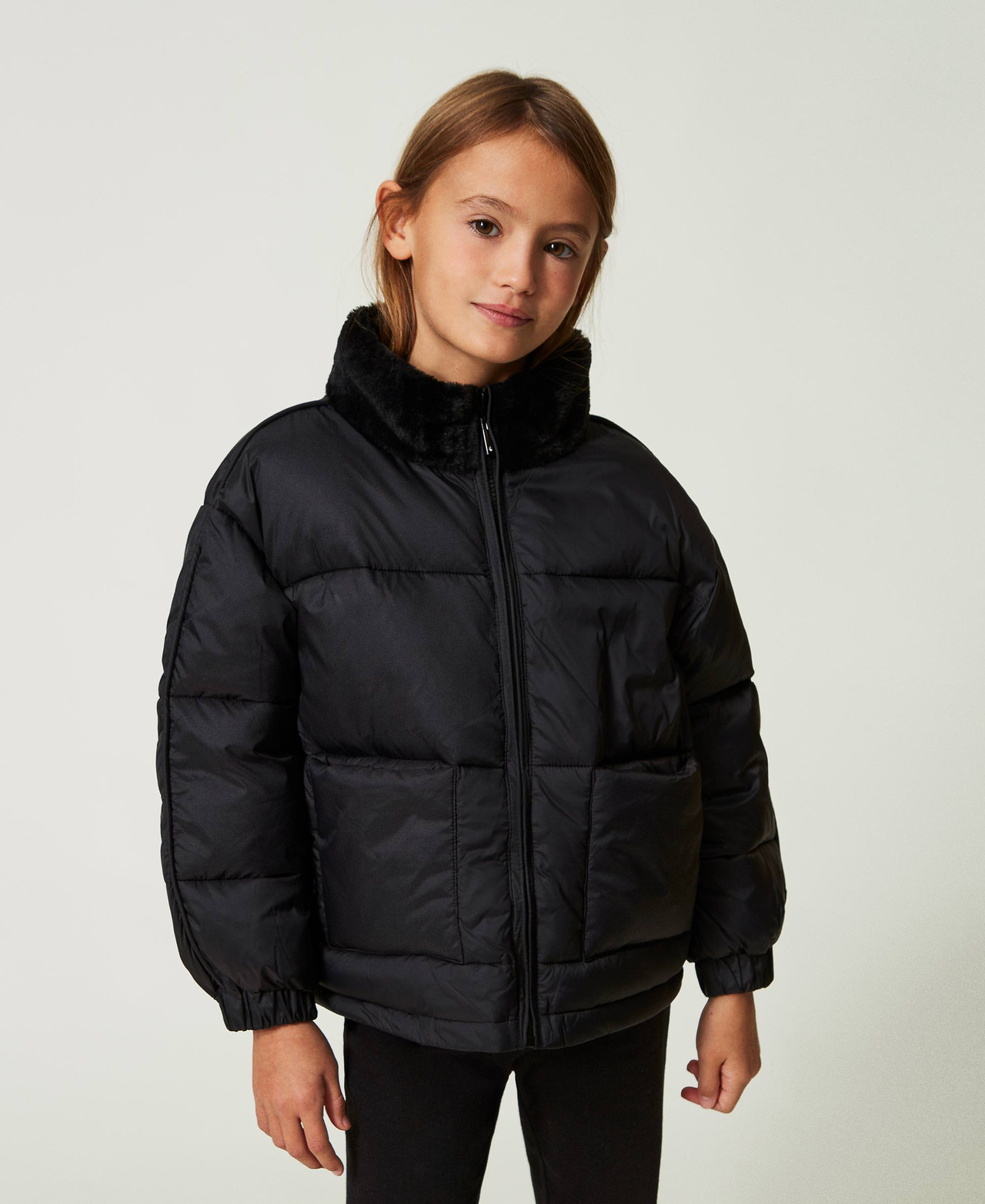 Steppjacke schwarz kurz clearance, Kurze Steppjacke mit Pelzimitat Mädchen, Schwarz | TWINSET Milano clearance