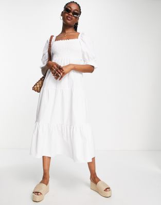 Stradivarius popeline kleid clearance, Stradivarius – Gerafftes Midikleid aus Popeline in Weiß mit Puffärmeln clearance