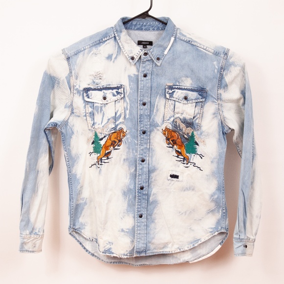 Akoo denim shirt clearance, Akoo Denim Distressed Button Down Shirt clearance