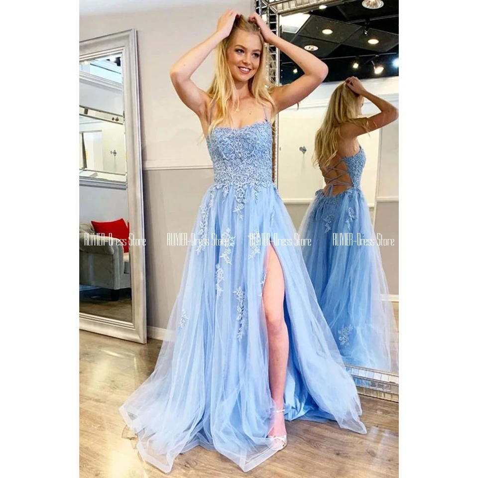 Light blue tulle dress clearance, Light blue tulle lace long prom dress clearance